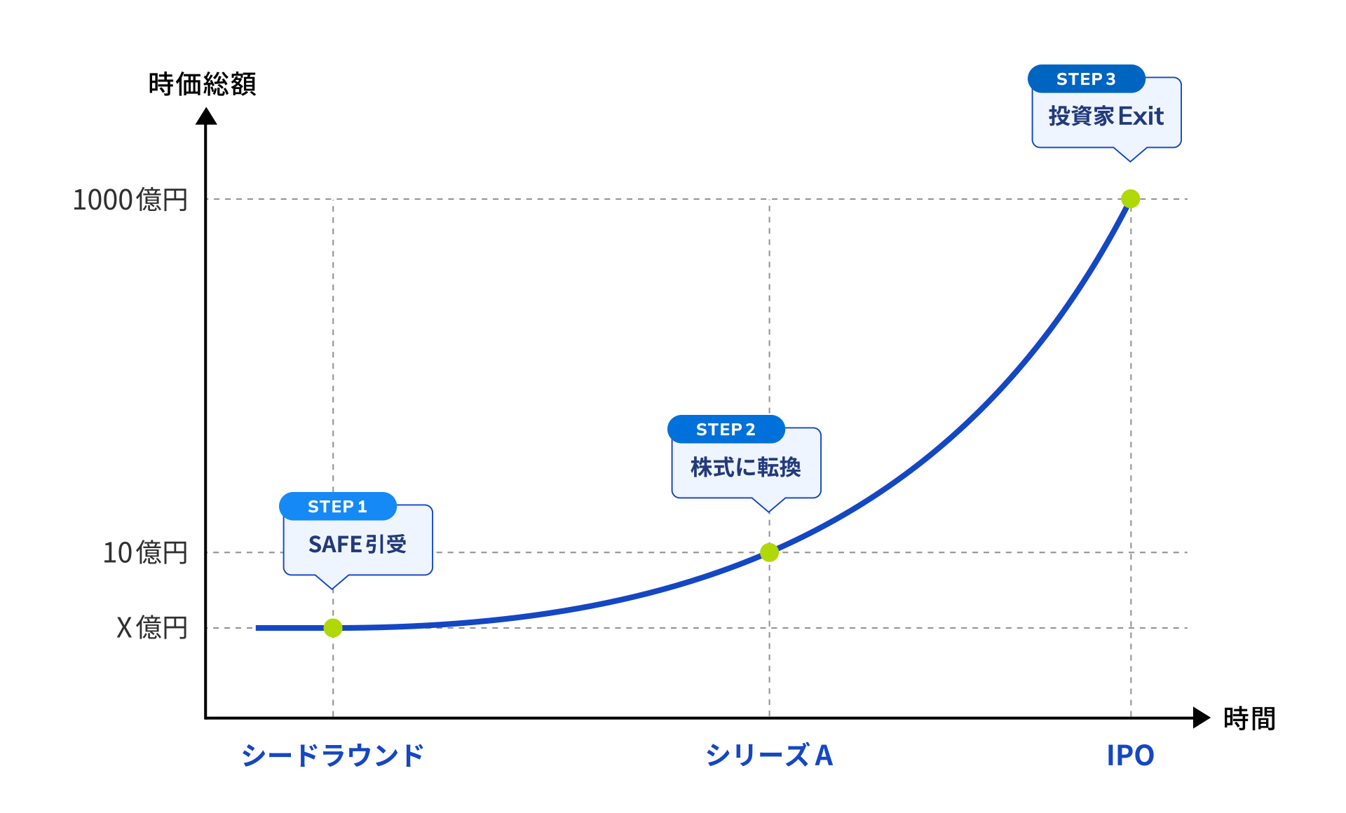 SAFE投資家は、評価額上限及びディスカウントという仕組みがあることで、後から参加する投資家よりも通常有利な条件で投資できます。